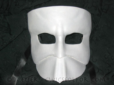 ![]() The Bauta is a traditional Venetian design, a mask intended expressly for disguise; donned by men and women alike for unseen passage and anonymous dealings, it was traditionally worn with a tricorn hat and cowled cloak. The frogmouth, angled away from the face while still shielding it from view, allowed the wearer to eat, drink, and otherwise use his or her mouth while maintaining the disguise; the shape also alters the wearer's voice slightly, changing the timbre so as to further decrease the chances of being recognized. This original variation on the traditional design features a slightly furrowed sculpted brow, a rounder mouth, and a prominent philtrum, more facelike and emotive than the traditional mask. The mask covers the whole of the face, its squared-off brow intended to meet with a hat. Lined in a natural suede and bound with ribbon ties. To picture every available permutation of this design would be an impossible task, and would sadly exclude your own ideas. Please do not hesitate to send a note if you have an idea and would like a quote or to discuss a design. Pricing Guide: - Available in a particolor scheme, two colors divided vertically down the center of the face, from $70. - Available with small scrollwork detail in a second color from $70, in particolor with alternating or same-color detail from $75. - Available in elaborate particolor scheme with one side covered in flat scrollwork detail from $90. - Any more elaborate painting or carving work will be priced on a case-by-case basis; please contact us for an estimate. |
