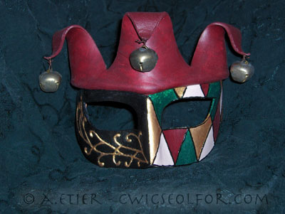 ![]() A festive mask for certain! - that is, unless you'd rather a somber one. This jester, based on the Columbina mask, features a sculpted hat with three belled points over a face in the traditional Venetian style. Wonderful on both men and women, an energetic and playful design. Lined in a natural suede and bound with ribbon ties. The potential for variety in this mask is tremendous. To picture every available permutation of this design would be an impossible task, and would sadly exclude your own ideas. Please do not hesitate to send a note if you have an idea and would like a quote or to discuss a design. Pricing Guide: - Particolor Jesters, with two colors divided straight down the nose on the face and a solid hood of any color, run from $62. - Quartered Jesters, with two colors each on the face and the hood, run from $66. - Jesters featuring a complex color scheme and dimensional paint, such as the featured one at the head of the page, start at $95. - Any more elaborate painting or carving work will be priced on a case-by-case basis; please contact us for an estimate. |