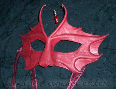 ![]() In a small size much like an eyemask, this dragon would seem harmlessly pretty were she not razor-sharp. Her delicate features and gentle sculpting contrast her elegant, tiny ferocity, bright and blazing as the seven brilliant Swarovsky crystals that drop between her slender tines. Makes a great Couples' mask when paired with the Large Dragon. Lined in a natural suede and bound with ribbon ties. To picture every available permutation of this design would be an impossible task, and would sadly exclude your own ideas. Please do not hesitate to send a note if you have an idea and would like a quote or to discuss a design. Pricing Guide: - Accent colors may be added starting at $85. - Leather with a texture as pictured is individual and exceedingly rare - this mask was originally designed for the sake of the satiny feel and naturally-occuring scaly pattern. The price of such another mask, if such materials could be found, would be increased proportional to the cost, time and effort involved. It can be done, but do not expect the base price. Alternately, scales could be carved into the mask, pricing starting at $110. - Any more elaborate painting or carving work will be priced on a case-by-case basis; please contact us for an estimate. |