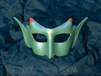 ![]() A woodland sprite, somewhere between Puck and Pan - a small, pointed nose slants delicately from the brow, where small horns and a second pair of horn buds protrude, and long, spired ears slope gently upward. Tooling on the ears, nose and horns defines flesh and texture, and the gentle shaping defines cheek and browbones. A wonderful mask in any color scheme, but a sunlit golden green with silver accent gives an effect reminiscent of translucent skin. Lined in a natural suede and bound with ribbon ties. To picture every available permutation of this design would be an impossible task, and would sadly exclude your own ideas. Please do not hesitate to send a note if you have an idea and would like a quote or to discuss a design. Pricing Guide: - Any more elaborate painting or carving work will be priced on a case-by-case basis; please contact us for an estimate. |